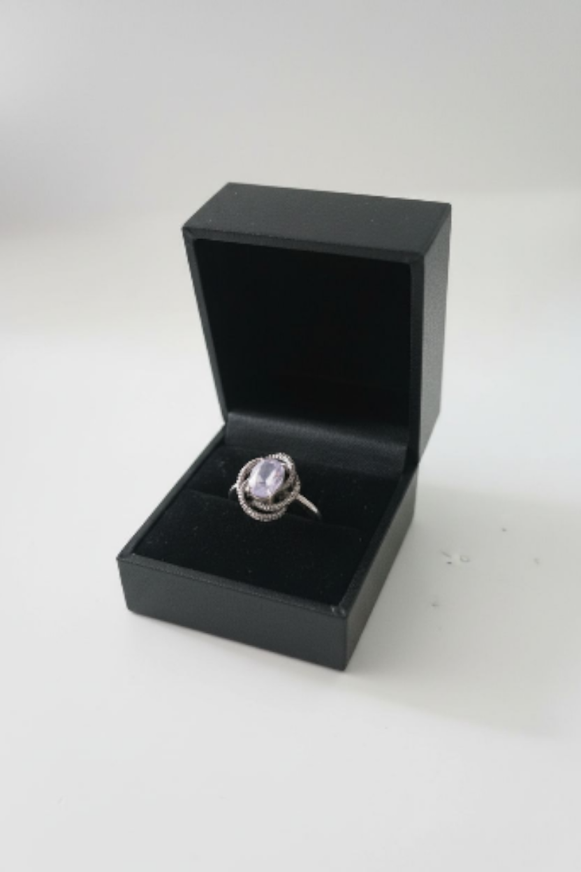 Im Zentrum strahlt ein großer, facettierter Lilienquarz (1,030 ct) im Ovalschliff, begleitet von vier funkelnden weißen Topasen im Brillantschliff. Gemeinsam verleihen sie dem Ring eine klare, feminine Leuchtkraft.