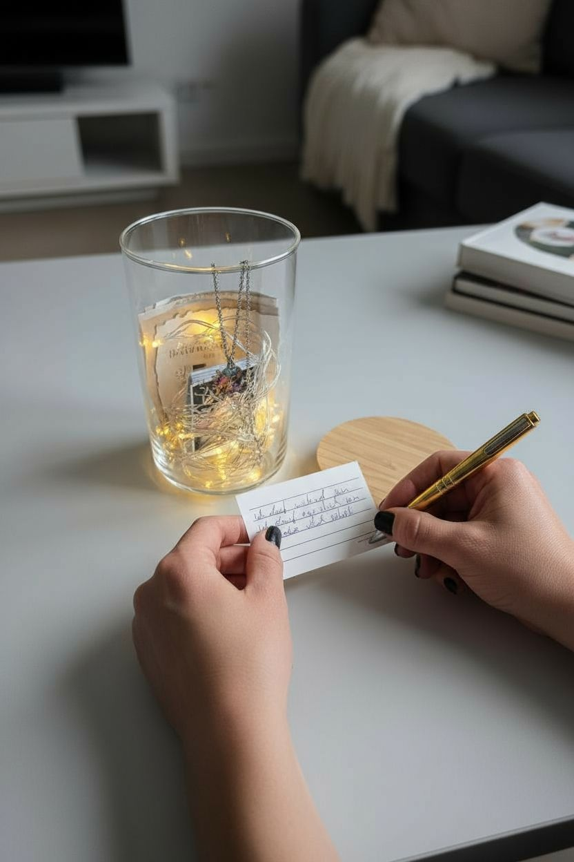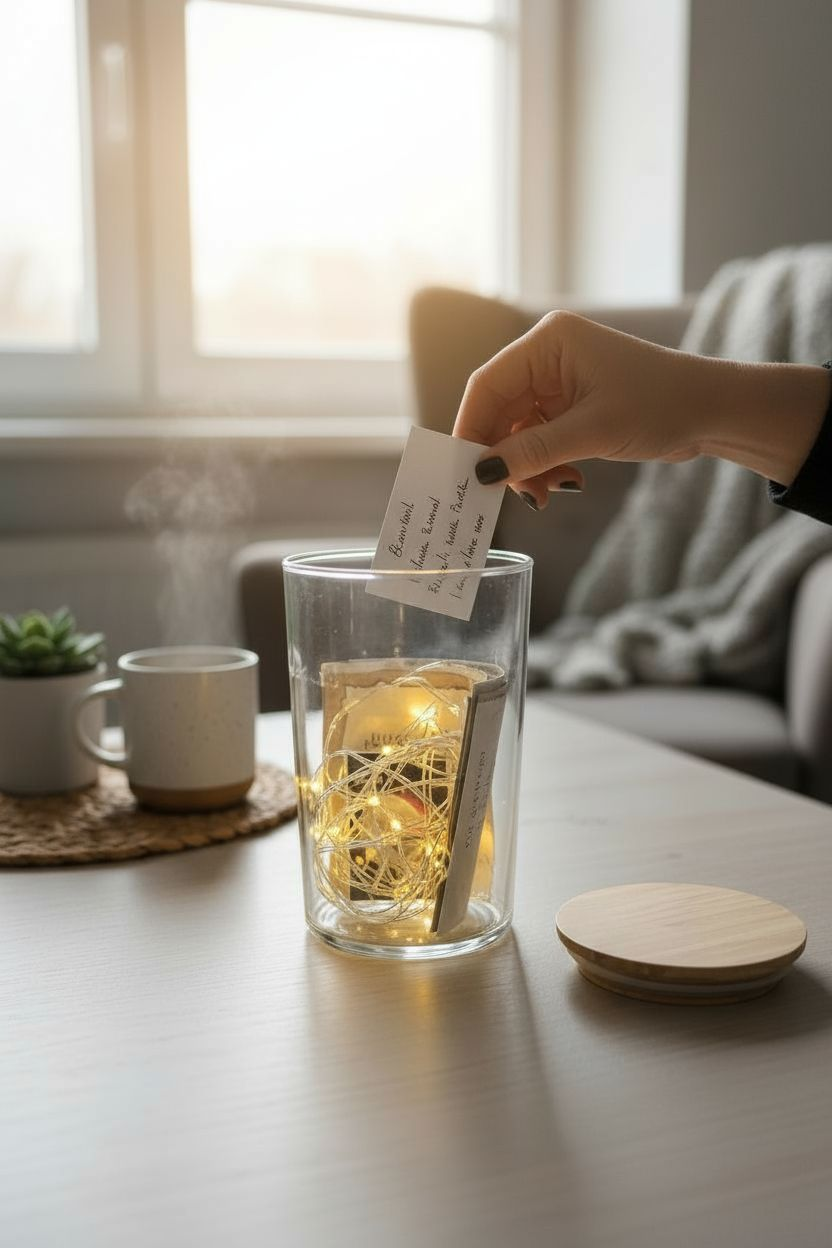 Eine feine Lichterkette (betrieben mit 2xAA Batterien), beschriftbare Kärtchen und eine liebevolle Anleitung machen dieses Ritual zu einem Moment des Ankommens bei dir selbst.