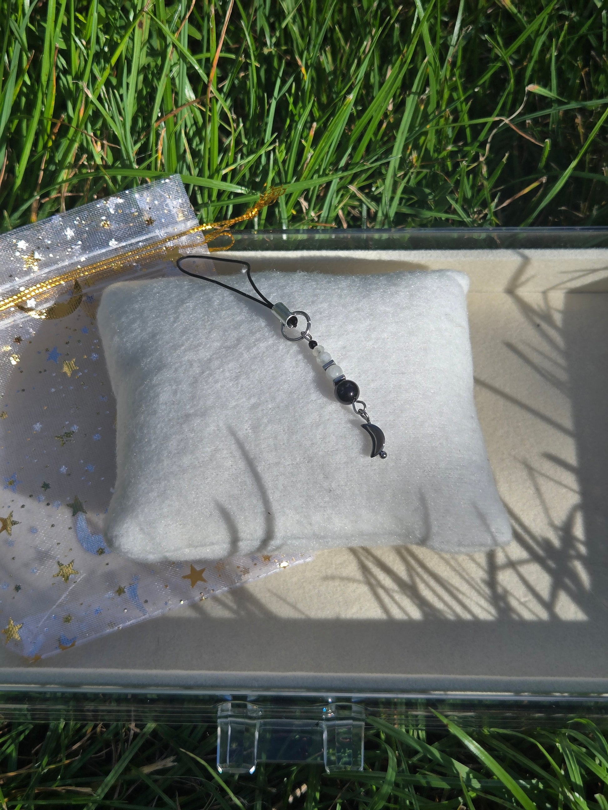 Ein stilvoller Halbmond-Anhänger, verziert mit Mondstein, schwarzem Achat und Hämatit, wird zu einem kraftvollen Begleiter im Alltag – nicht nur als Accessoire, sondern auch als energetischer Talisman.