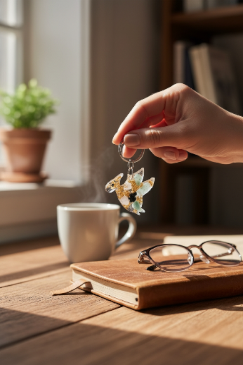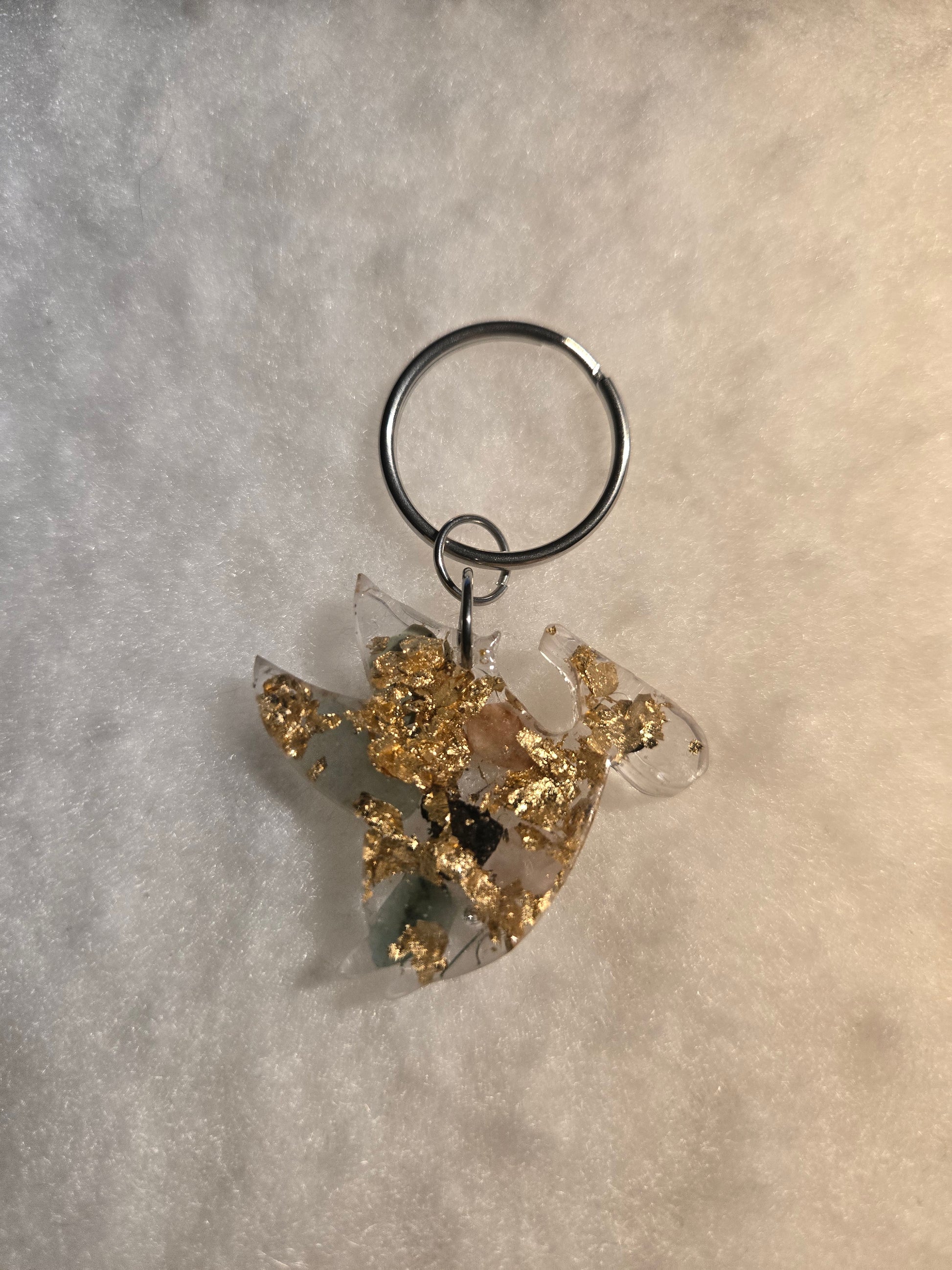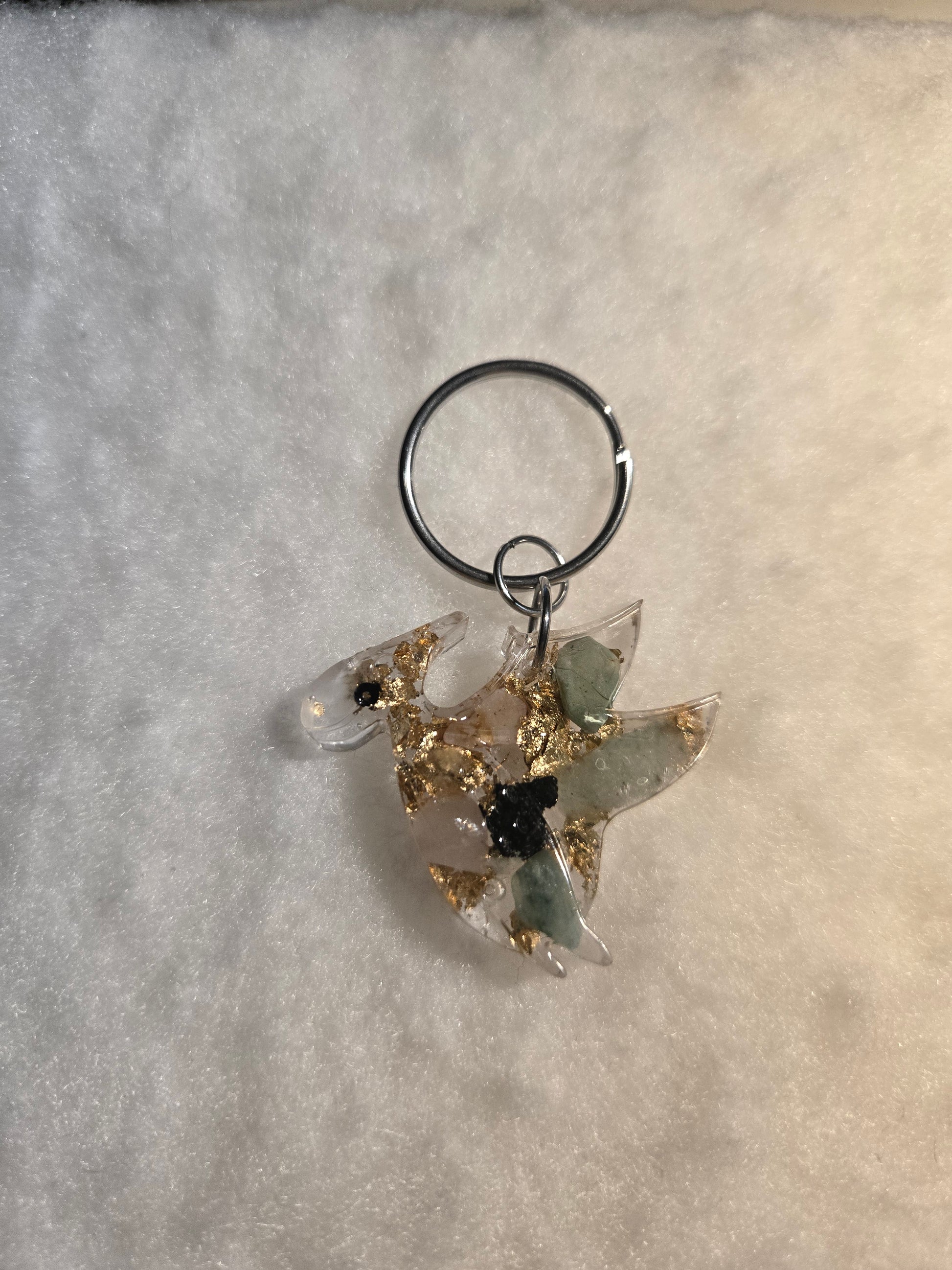 Dieser handgefertigte Pteranodon-Schlüsselanhänger ist ein kleines Highlight für Dino-Fans und Liebhaber besonderer Accessoires. Jeder Anhänger wird einzeln in Epoxidharz gegossen und enthält verschiedene Halbedelsteine sowie ein goldenes Metallblatt, die ihm eine edle und einzigartige Optik verleihen.