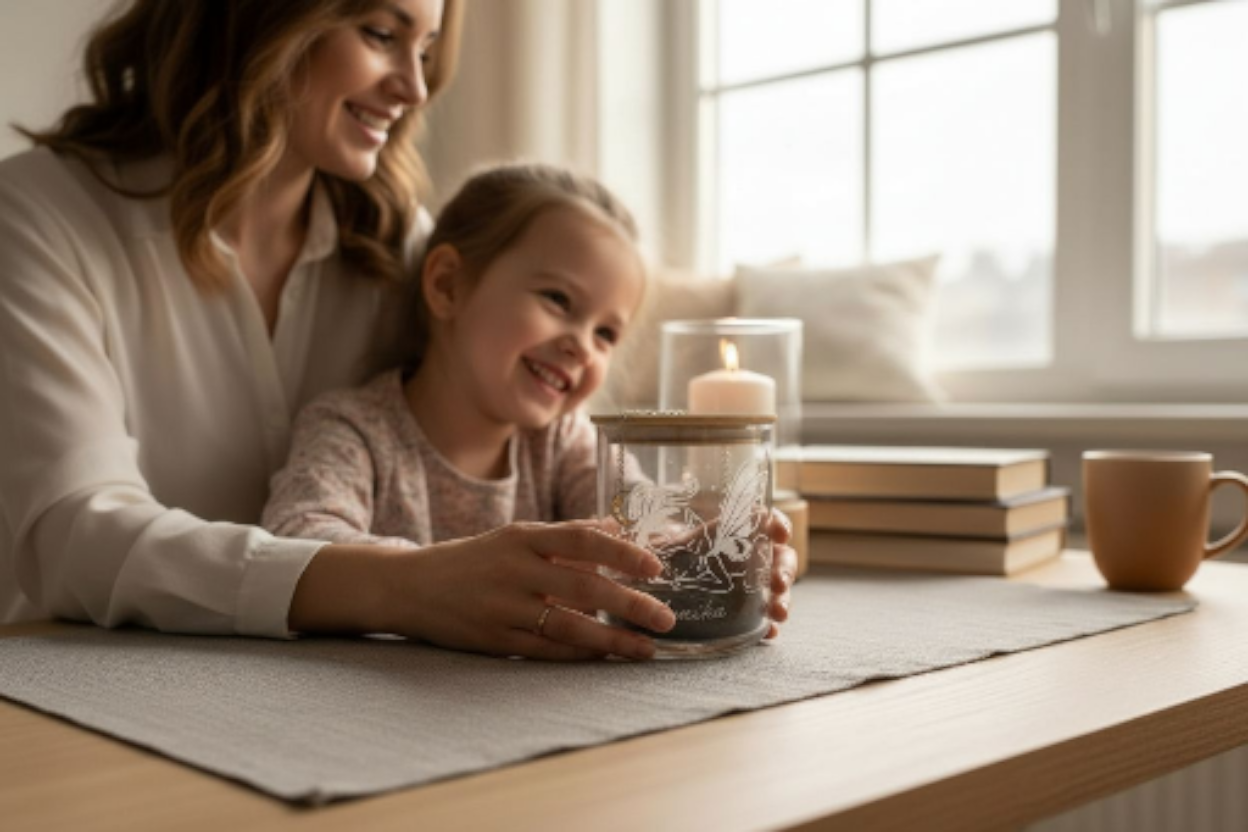 Eine feine Lichterkette (betrieben mit 2xAA Batterien), ein von Hand graviertes kleines oder großes Glas mit deinem Wunschmotiv oder Namen, beschriftbare Kärtchen und eine liebevolle Anleitung machen dieses Ritual zu einem Moment des Ankommens bei dir selbst. Dazu passend kommt ein Buch mit einer Geschichte über ein junges Leprechaun Mädchen auf ihrer Reise zum Glück, es beinhaltet Reflexionsfragen und viele Seiten zum Ausmalen und gestalten um dich mit deinem Kind zu verbinden, als kleines gemeinsames Abendritual.