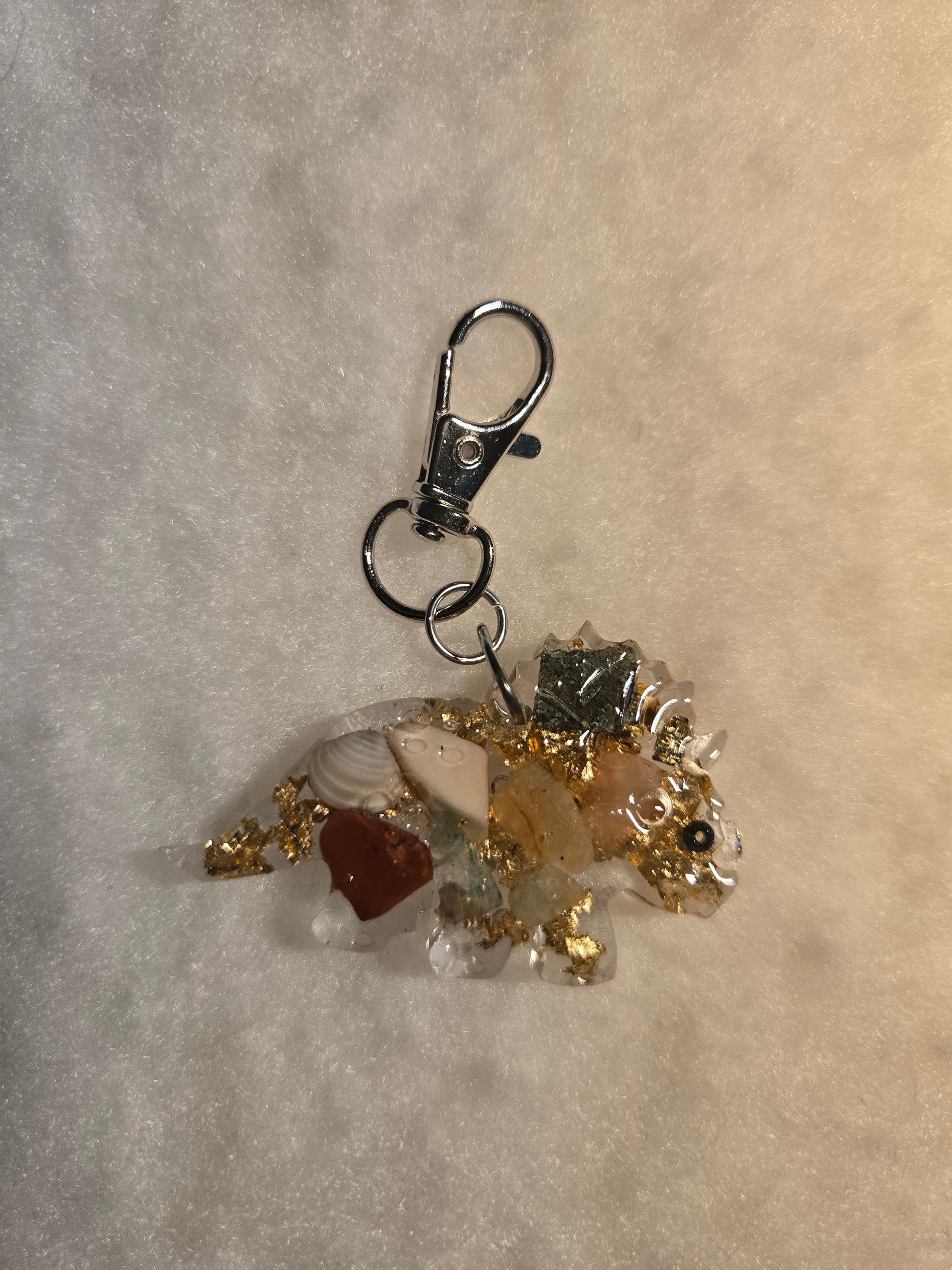 Triceratops Schlüsselanhänger (4x5cm) aus Epoxidharz – mit Halbedelsteinen