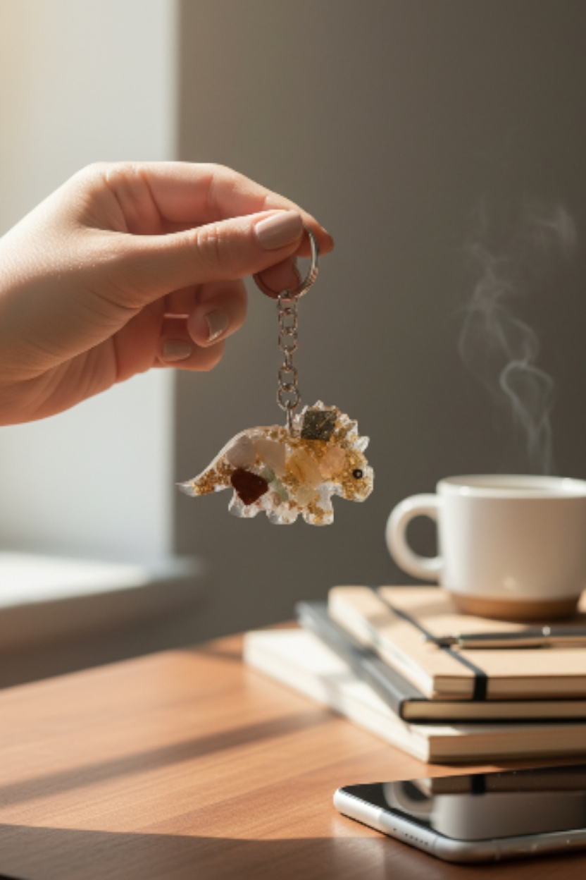 Dieser handgefertigte Triceratops-Schlüsselanhänger ist ein besonderes Highlight für Dino-Fans und alle, die individuelle Accessoires lieben. Jeder Anhänger wird sorgfältig aus glasklarem Epoxidharz gegossen und enthält verschiedene Halbedelsteine sowie ein goldenes Metallblatt, die ihm einen edlen, einzigartigen Look verleihen.